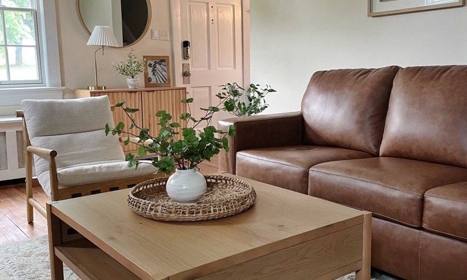 The living room features a comfy leather couch, two accent chairs, a coffee table, cozy blankets, and a large TV. Streaming apps are available for your personal log ins.