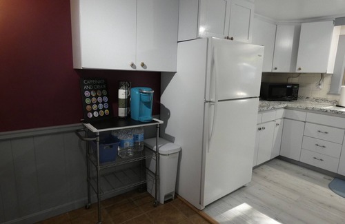 We provide a Keurig coffee maker, toaster, microwave, brand new stove with oven that has convection and air fryer options. We provide paper, plastic and Fiestaware dinnerware.