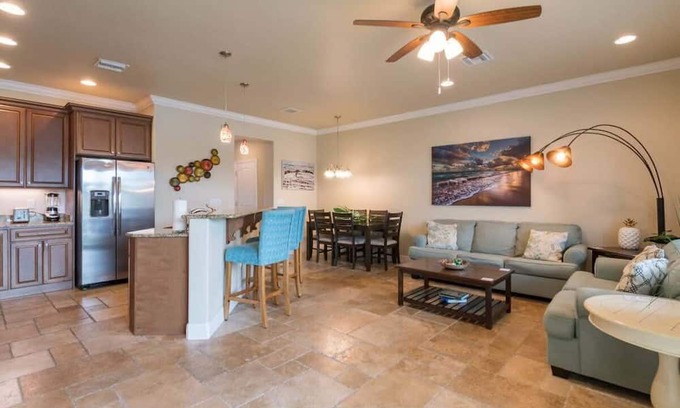 Enjoy the comfort of our two-story townhome featuring three bedrooms upstairs, complete with two full baths, and a convenient half bath downstairs. The open-plan ground floor boasts a fully equipped kitchen, dining, and living area, leading to a patio—perfect for morning coffee. Accommodations include a king bed in the master, twin beds in the second bedroom, a queen in the third, and a queen sleeper sofa in the living room. An attached garage houses laundry facilities for your convenience.