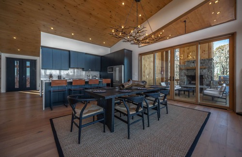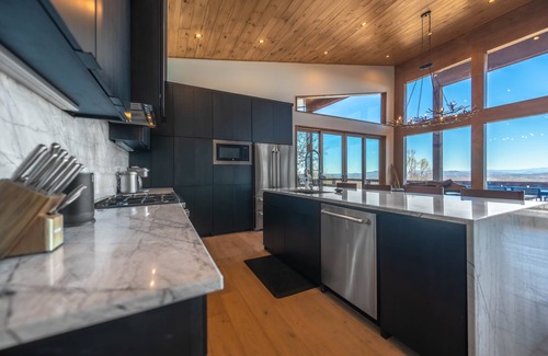 Step through the front door to an open floor plan and 15' wood ceilings. A wall of floor to ceiling windows greet you with a perfect marriage of mountain and lake views that can only be described as breathtaking. Trust us, the pictures cannot do this view justice! The modern, sophisticated design elements and furnishings found throughout this home are akin to what you’d experience at the finest hotels. As you make your way into the living room, a striking slate wall with linear fireplace invites you to curl up on the plush leather sofa or sit in shearling swivel chairs, able to face either the fireplace or stunning views of the mountain lake. Sonos speaker systems on both levels allow you to enjoy the game on the TV or relax to your favorite tunes. A custom-built 100+ year old live edge Elm table found in the center of the living room exemplifies the unique glamour of Capstone. There is also a convenient half bath off the main living area with a one-of-a-kind live edge vanity. The gourmet kitchen is fully equipped and ready to serve with beautiful Italian stainless-steel appliances and espresso maker. The impressive marble waterfall island and matching slab backsplash, along with custom maple cabinets elevate the look to new heights.