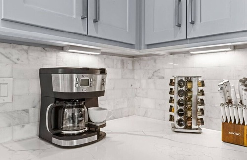 • Dual coffee station (Full-size coffee maker + Keurig) with starter pack
