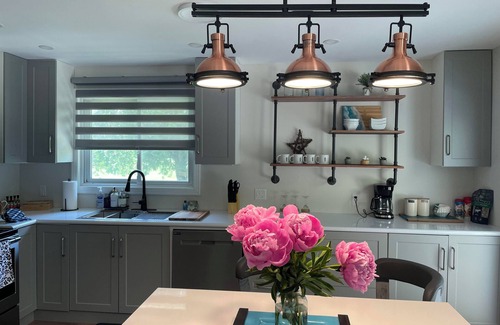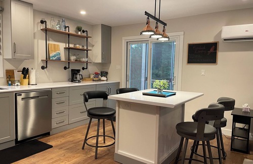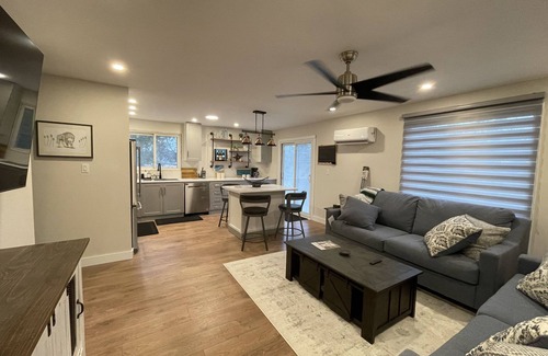 Inside, you’ll find modern comforts and thoughtful touches, including Wi-Fi, onsite parking, and luxury essentials like plush towels, soaps, shampoos, laundry detergent, and fresh linens. The newly renovated cottage features an open-concept layout, new appliances, stylish furniture, and cozy sleeping for six. The master bedroom offers a queen bed and a private deck nestled in the cedars, along with a quiet, well-lit workspace. The second bedroom includes a full-size bunk bed and its own smart TV.