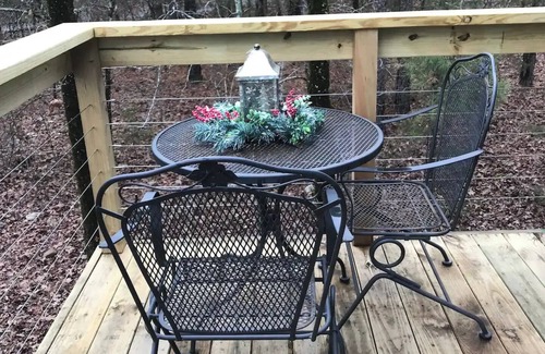 This 2020 built treehouse cabin is located in a pine & hardwood forest. It is one of 2 cabins that are approximately 100 yards apart through the forest. The cabin has a king size bed & a queen size sleeper sofa. It has a soaker bathtub as well as a shower and a full kitchen with all cooking essentials, an outdoor grill & fire pit. Firewood is provided. The large deck downstairs has a hot tub, hammock chairs & a swinging bed. The property joins Ouachita National Forest.