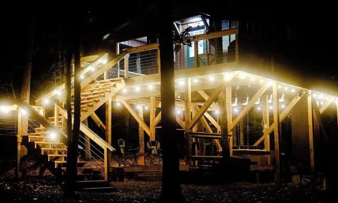 This is a unique treehouse cabin with fabulous outdoor living on the deck underneath the treehouse. The deck features hanging hammock chairs, a swinging bed and a hot tub and off the deck a fire pit. You are surrounded by a beautiful forest. Very relaxing atmosphere.