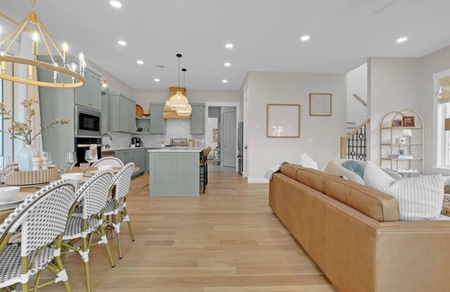 The first floor also features a tranquil King Master Suite — your own private haven after a day of adventures. Just beyond the living area, the expansive wraparound porch invites you to slow down and soak in the views of Lincoln Square Park. Relax on the classic porch swing with a cup of coffee in hand or unwind with a glass of wine as the sun sets over the community.