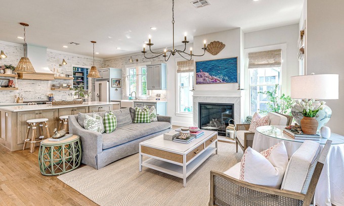 A beautifully curated living area with lux furniture awaits inside the entryway. Guests will love settling in for a cozy movie night in front of the flat-screen tv , which is mounted just above the fireplace. The stunning kitchen is perfectly equipped to prepare fresh meals with elite Café appliances, coastal color cabinetry, beautiful quartz countertops and a working pantry . The large extendable dining table and 4 rattan counter stools provide ample seating to enjoy mealtimes together. Toward the back of the main level, you will find the primary king suite with soaking tub and large shower.