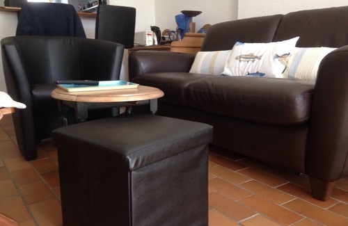 The kitchen open to the living room is fitted and equipped: 4 burner gas hob, electric oven, microwave, fridge / freezer, dishwasher, washing machine, coffee maker, and Nespresso, toaster, electric kettle, steamer, blender . A bedroom with a bed of 160X200, wardrobe and storage, the other room with three beds 90X190 including a convertible bed in adult bed. Staircase steps without counter-step. I do not supply linen. Possibility of renting linen on Carnac that you will find on the internet.