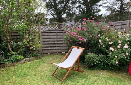 House with garden and terrace facing south in a quiet residence with private parking. The garden is enclosed by wooden fences height 1. 80. You have a terrace, with table and chairs and 2 sun loungers, Parasol.