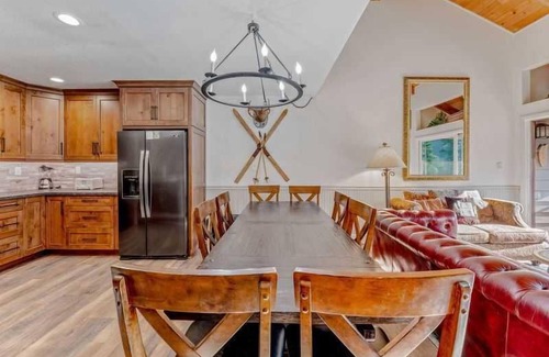 Welcome to this warm and inviting townhome, featuring 3 bedrooms, 3 outdoor balconies, and dynamic loft space—perfect for a comfortable stay. The home’s wood-paneled walls, high ceilings, and expansive windows frame serene forest views, while charming mountain decor and cozy furnishings create a relaxing atmosphere. The bright, open-concept living area on the main floor includes a cozy living room with a gas fire and a 50” Smart TV, a well-equipped kitchen with updated appliances, and a 9-person dining table. Step outside onto the balcony to enjoy tranquil forest views, or gather indoors where natural light floods the space. A full bathroom with a single-sink vanity and a bathtub/shower combo is conveniently located near the kitchen.