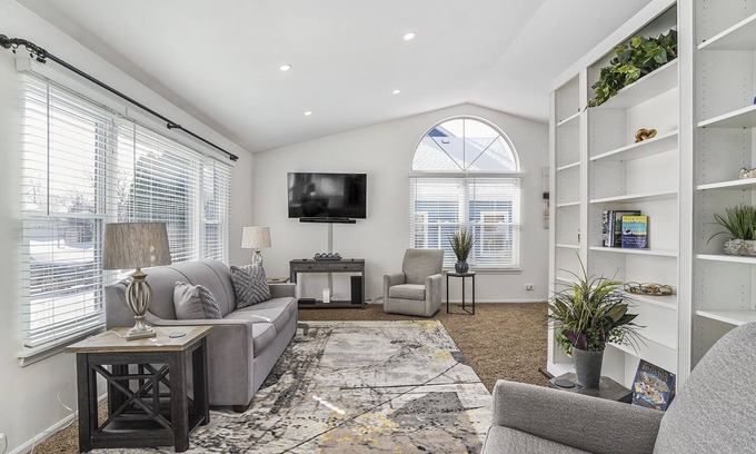 2300 SF renovated unit is 8-9 min away from interstate 355, an 28 min to O’Hare! This property has 3 bedrooms, & 2.5 bathrooms. Master suite has a KING, and 2 bedrooms have a Queen. The living room has room for 1 air mattress (Total of 4 beds). Plenty of Kitchen utensils, all you need in a kitchen, including cooking spices and oils! Children friendly & lots of technology!