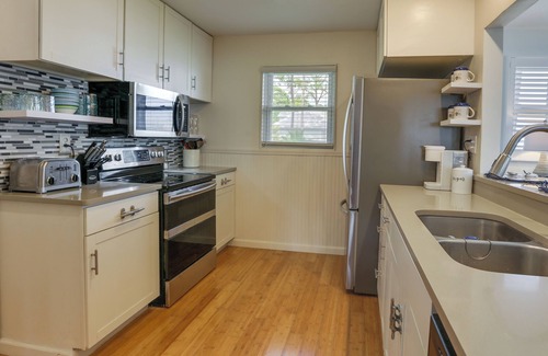 KITCHEN: Dishwasher, stove/oven, toaster, microwave, refrigerator, coffee maker, blender, cooking basics, Crockpot, dishware + flatware, ice maker, water filter, trash bags + paper towels, complimentary coffee, tea + snacks, breakfast bar