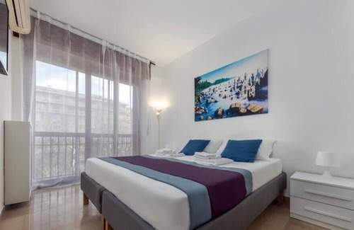 The apartment has 4 bedrooms, 2 bathrooms, linens, towels, flat-screen cable TV, dining area, fully equipped kitchen, and balcony with city views.