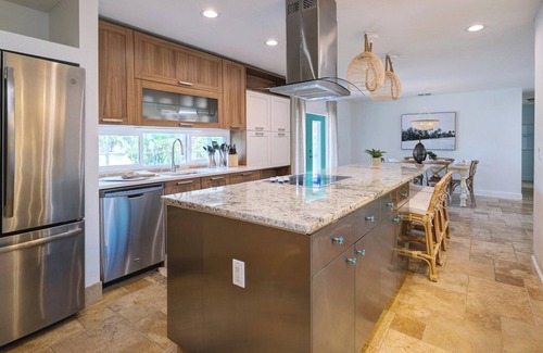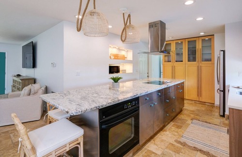 The tropical landscaped yard welcomes you into an open living area with lots of comfortable seating and a large SMART TV mounted for you to enjoy your favorite entertainment. The updated, spacious kitchen has granite countertops with a breakfast bar for snack time. There is a large dining table that seats six comfortably and has a great view out to the pool area.