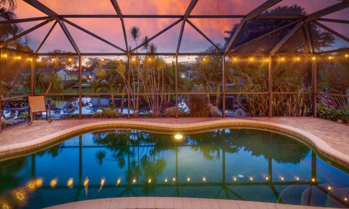 Out the patio doors, you'll find a beautiful screened-in heated pool with plenty of room for everyone to relax, in or out of the water. A large dining table and gas grill make dining al fresco easier and more fun than eating out! String lights hang around the cage for magical evening hours enjoying the warm air and even the warm water after the sun goes down.