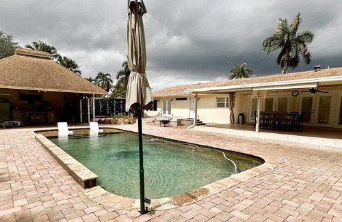Two Master bedrooms on each end of home, beautiful backyard with sunning deck pool, large bar/pavilion with TV visible from pool, watch your sporting event while catching some rays, outdoor music with speakers, equipped with Google home to listen to your favorite music in every room, great for small gatherings or family getaways or get together! We do allow small events up to 50 guests with permission from owner and please read house rules. Tours are welcome. Approximately 15 minutes to Sawgrass mills mall Sunrise and FLA Live Arena. Please read all requirements for gatherings. Thank you!
