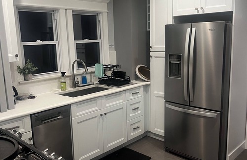 This is truly a hidden gem, boasting incredible accessibility to an intersection of activities, cuisine, and culture. Access to NJ waterfront on the Hudson, exploration opportunities are endless, and it has everything you need for an exceptional vacation. 2 bedrooms- 1 king size bed, 2 Full size beds, 2 air mattresses if needed, and a pak and travel playpen for toddlers. Sunroom with office to plug in for work or play. Large living room with beautiful leather sectionals, open concept dining room, large kitchen- fully equipped, spacious bathroom, and 960 sq feet of outdoor space out back, nice size backyard. A wonderful way to start your day either with breakfast or coffee; it's really great energy!