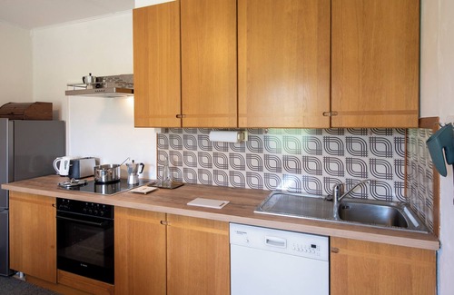 Inside, guests can relax on comfortable sofas and watch TV in the cosy living room. The separate kitchen is well-equipped with a cooker hob, a coffee machine, a dishwasher, a fridge freezer and a dining table with four chairs.
