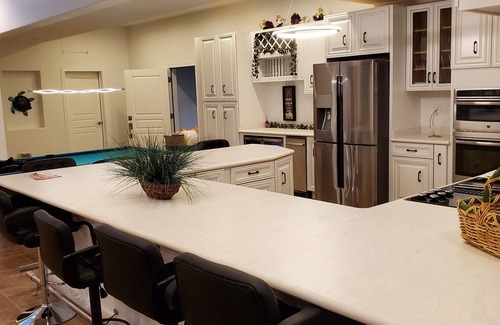 Casa del Lago is a spacious two-story house. The top floor has an open floor plan where the spectacular lake view can be enjoyed from the large deck, well-appointed kitchen area, and adjoining dining area with seating for eight and an inviting living room. The kitchen is a chef’s dream. Create your meals while taking in the view and conversing with others at the kitchen island that seats 8 people. A beautiful rock fireplace is in the center of the living room. Just off the living room is a huge covered balcony overlooking that large yard and out to the lake. The master bedroom has a roomy 2-person jet tub and a fabulous king bed. The second bedroom has a California king memory foam bed. Both have plenty of storage.