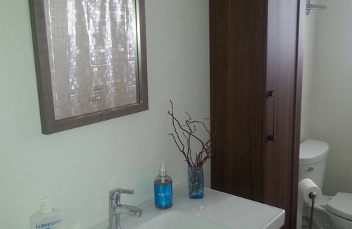 Enjoy access to microwave, some fridge space, kettle, coffee maker, toaster, glassware, can opener, wine bottle opener, pannini press, hand blender, mugs, plates, bowls, wine glasses, silverware, paper towels, dish towels, napkins, plastic cups, hand soap and dish soap. No stove or cooking.