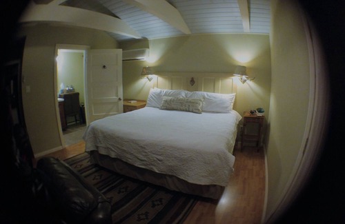 Your Casa Hermosa King Suite provides efficient luxury for the single traveler and a cozy, romantic nest for a couple. You’ll enjoy a comfy king-size bed beneath a cathedral ceiling, a full bath, a kitchenette, private parking, and a view of Sleeping Lion Mountain from your easy chair! Just out the door, take advantage of your own flagstone-walled patio. You’ll find a flat-screen cable TV, DVD, and free wireless. And we’re pet friendly, so bring the pooch.