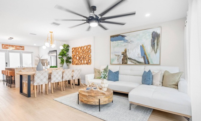 Casa Largo, a tropical oceanside getaway in the famous Key Largo. This stunning new beachy villa has two master bedrooms and three bathrooms. Accommodates up to 8 guests, including a mix of adults and children, or a maximum of 7 adults. This vibrant and beautifully designed villa is the perfect home base for exploring all of the Florida Keys!
