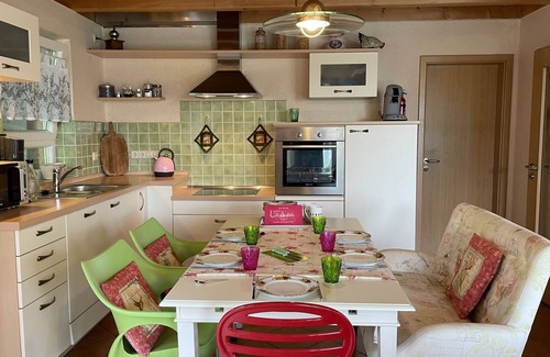 2-room house 100 m2 on 2 levels. Cosy furnishings: living/sleeping room with 1 double bed, satellite TV and DVD. Exit to the terrace. Open kitchen (oven, dishwasher, 4 ceramic glass hob hotplates, toaster, kettle, microwave, electric coffee machine) with dining table. Sep. WC. Upper floor: 1 open room with sloping ceilings with 1 double sofabed (140 cm), 1 double bed and bath/shower/WC. Exit to the balcony. Gas heating, underfloor heating. Terrace. Terrace furniture, barbecue, deck chairs. Facilities: children's high chair, baby cot. Internet (WiFi, free). Please note: non-smokers only. Smoke alarm, fire extinguisher. Bed layout is flexible. There are more sleeping options available than the maximum number of people allowed which may, however, not be exceeded.