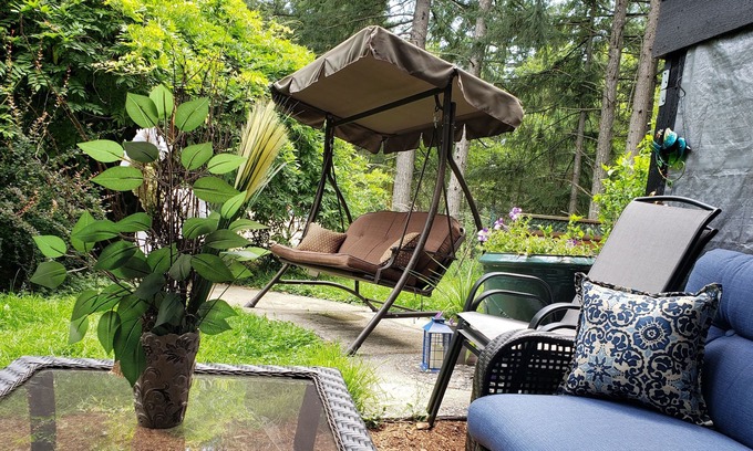 Please note: Breakfast items will be provided for your first morning only or until the items are gone. As well, some condiments, coffee and tea will be provided. We are on a well system so our water is pure, clean and fresh from an aquifer deep below the ground so it's free from Chlorine. In the warm summer months, the guest suite is naturally a nice comfortably cool temperature. The entire house has built in air conditioning for when the summer weather is at it's peak. Please feel free to enjoy the the outside space as well. There is a Barbecue for your use as well as a picnic table, swing seating and lounge area. Have a meal, a drink, read or just relax and enjoy the lush quiet space. Current special: for one bedroom (either 1 x queen size or 2 x twins), two bedrooms or with third bedroom (1 x twin - small bedroom without window). No extra cost for extra rooms for a limited time.