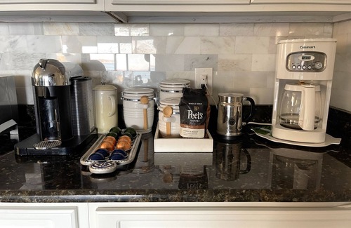 The house comes with almost everything you need. Fresh linens, towels, fire logs, a fully equipped kitchen with lots of fun stuff like Ninja Mixer, NuWave Oven, Bread Maker, S'mores Maker, Ice cream Maker and a beautiful charcoal grill and a new gas grill on the deck by the kitchen.