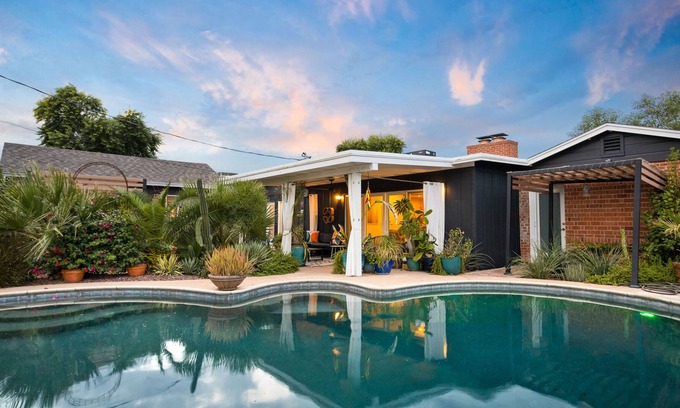 This 5 bedroom, 2 bathroom home will make you feel stylish and fresh with its mid-century modern design. This home has fine details throughout. The living room is perfect to get together on the big comfy couch and watch TV. Eat outside in the garden front with 12 of your friends and family at the long table or relax poolside in the backyard with the gorgeous native plants that make you feel like you are in paradise. The home has a little casita that is decked out for a groovy monochrome ambiance and a wine fridge to help keep drinks chilled.