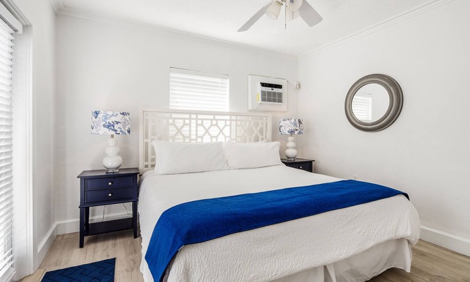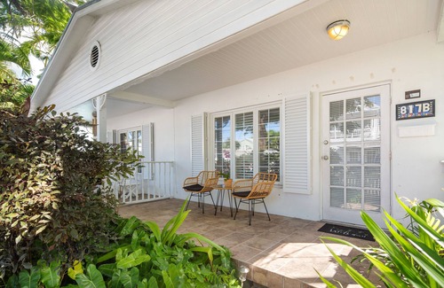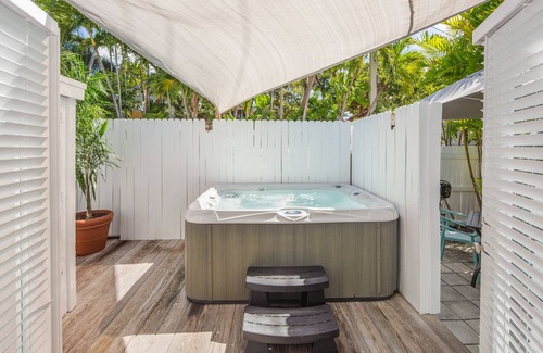 The spacious king bedroom with wall mounted TV, wall AC and new furniture includes dual night stands with storage, bedside lamps, and a beautiful white headboard. French doors lead out to your private hot tub. The ensuite bath includes a pedestal sink, open storage shelves and tiled stall shower with glass door. New patio furniture and a sun shade adorn your backyard oasis. Start your day with coffee on the covered front porch. Take your bike or walk to Duval Street and enjoy all the excitement that make Key West unique. When you are done for the day, come home and enjoy dinner on the grill and a hot tub massage in a peaceful part of town!