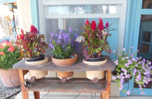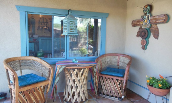 Casita Juliet has all appliances, dishes and kitchenware, towels and bedding in a charming intimate yet roomy little house. Ceiling fans in bedroom and living room as well as screened windows and door for summer visits. Electric baseboard heaters in all rooms insure cozy winter stays. It has two outdoor living areas and of course a ridiculous number of plants--a signature of mine...
