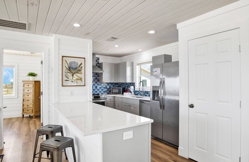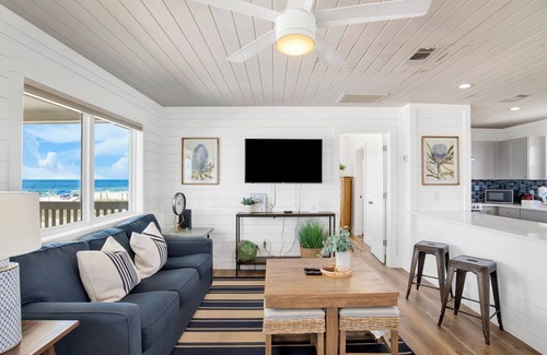 The two bedrooms each have their own full bathroom. The east bedroom is set up as a guest room and has sleeping for 2 with a queen bed. The west bedroom is the master and features captivating beachfront views with sleeping for 4 with a king bed and a bunk bed. In between, you will find the spacious living room with a sleeper sofa to sleep 2 on the beachside and the kitchen dining room on the roadside. With a front and back deck, you can choose the shaded seclusion of the covered front porch or the sunny back porch perfect for laying out. The interior of this lovely home boasts a spacious living room that opens to the dining room area, as well as a fully equipped kitchen with appliances, cookware, and plenty of counter space for sharing meals and moments together.