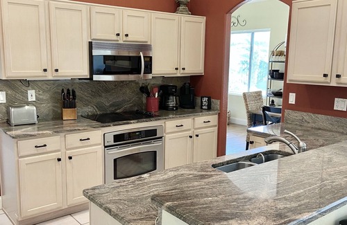 You will love your stay here! Beautiful furnishings, linens, kitchenware and hardwood floors complete this single level, 3 bedroom, 2 bath home. Our home is meticulously cared for and is ideal for families or couples featuring two beautiful king bedrooms. The fully stocked kitchen is equipped with stainless steel appliances and granite counters for your enjoyment. At the end of the day relax in the adjoining family room with gas fireplace. New furniture was added in the Fall of 2020. You'll enjoy unwinding in this bright and airy room. A flat screen TV with Xfinity cable service, NETFLIX and a collection of DVDs will provide hours of entertainment. Free wifi is “Extreme Pro” service with 809 megabytes capable of 11-12 devices at one time. The large patio doors will give you a great view of the gorgeous yard and pool that is available to be heated. (inquire about rates)