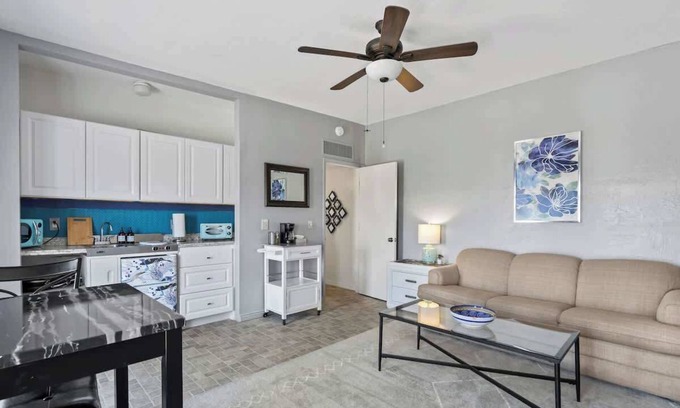 Self Check-in. Suite is accessed via a private entrance attached to owners Villa. Spacious bedroom with lush mattress, comfy lounge chair, and desk workstation. Full size bathroom with shower and jetted tub, and kitchenette for cooking smaller meals and dining in. Enjoy all the amenities of a hotel and more at this wonderful property.