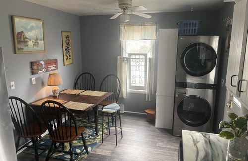 This is a townhouse apartment located steps away from Miller’s Ferry, on Catawba Island. About 100 steps from the Ferry property and about 200 steps to the shore! This is a quiet location within a triplex. There are two upstairs bedrooms with new floors upstairs and downstairs. The upstairs has a full bathroom and both bedrooms have TVs. Downstairs boasts a living room and adjacent half bathroom. Kitchen has a cozy sit in dining room with refrigerator, coffee maker, toaster and microwave. This year we added a washer and dryer. There is a patio area with propane grill and with table umbrella and plenty of seating.