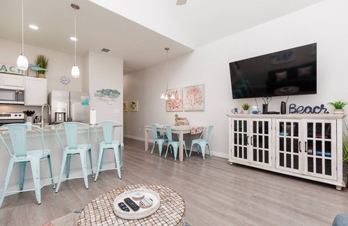 This charming 2-bedroom, 2-bathroom townhome in Smuggler's Cove is just steps from the beach, offering everything you need for a memorable stay. Families will love the resort-style pool and pirate ship playground, and with the kids' pool, swings, and direct access to your reserved parking, convenience and fun are never far away. Plus, it's pet-friendly—bring your furry friend along for the adventure! The open-concept living area combines the kitchen, dining, and spacious living room, so you're always in the heart of the action. The large sectional sofa doubles as a queen-size bed, and the flat-screen TV makes it the perfect spot for movie nights. With room for up to 8 guests, the first bedroom features a comfy king-size bed, while the second bedroom has a twin-over-full bunk bed with a twin trundle—ideal for families and groups. Located just across from the stunning Texas beaches, "Sea Ya Soon!" offers a relaxing and fun-filled home away from home. Book your stay today and make unforgettable memories at "Sea Ya Soon!