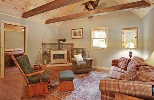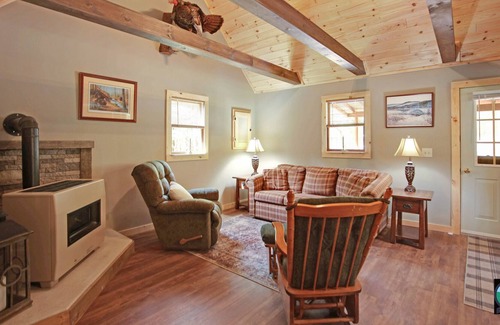 The newly renovated cabin boasts a surprisingly spacious floor plan with a full kitchen, bathroom, two bedrooms with queen beds, living room with gas fireplace and loft with two twin beds. Additional guest may use the available sofa bed in living area if needed. This rustic cabin has all the comforts of home with all the charm of a cozy cabin in the woods. The peaceful atmosphere is exactly the getaway you’re looking for whether it’s a couples retreat or family adventure.