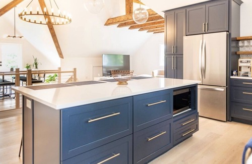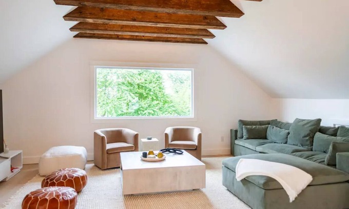 Unplug with the family or a group of friends at our cozy upstate retreat, located conveniently in heart of Catskill Village, down the road from Catskill Creek, a 10’ drive from trendy Hudson and Saugerties, 25 minutes from Hunter Mountain, and a 2 hr drive or train ride from NYC. This 4 bedroom 2 bathroom sleeps 10 people, perfect for a weekend getaway or spending a weeklong holiday with 2 families. Enjoy the mountain views from the balconies, luxuriate in the soaking tub or oversized shower with rainshower head and heated floors, enjoy a movie night on the 85 inch TV and plush sofa, or cook a meal together in the chef’s kitchen fully equipped with everything you need for a family dinner enjoyed at the dining table or outdoors on the massive back deck.