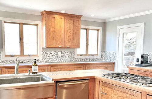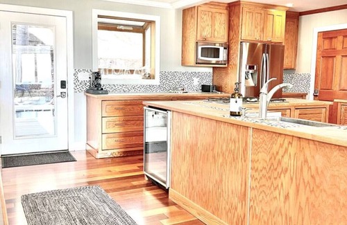A chef’s kitchen with gas cooktop, convection oven, farm sink, wine fridge, and breakfast bar