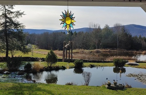 Our home away from home offers a large outdoor year round fire pit on our 24 foot porch with breathtaking mountain views, in the horizon. In the Spring, you'll get to feed our active, stocked pond filled with beautiful Koi and Goldfish, and see other wildlife, all around you.