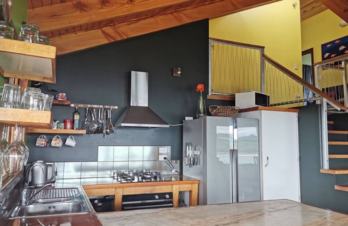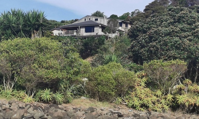 With spectacular 180° panoramic views over the Pacific Ocean this stylish and spacious house is surrounded by native bush and Kiwi Birds. It is privately located in an amazing location perfect for relaxing on the sun-drenched deck, entertaining friends & family and enjoying the beach and watersports available on your doorstep.