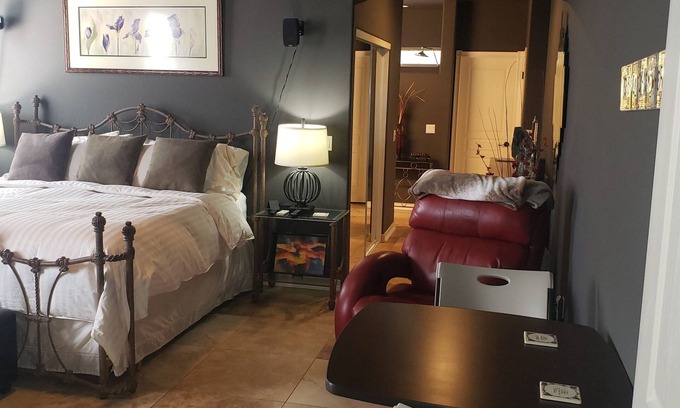 Private back entrance to spacious 600 SQ FT, clean, comfortable, master bedroom suite complete with small refrigerator, microwave, Keurig coffee maker, and hot and cold purified water dispenser. 60 inch Flat screen Smart TV with WIFI, Netflix, and local stations. Usage of laundry room available upon request. Walk out back door to covered patio onto 1 +acre property with sparkling pool, BBQ and firepit. Close to great restaurants, bars and old western town of Cave Creek where there is always plenty to see and do. Enjoy all the entertainment that Cave Creek has to offer. The unique western town of Cave Creek is close by and has so much to do from bull riding at Buffalo Chip, line dancing at Harolds, hot air balloon rides, horseback riding, hiking or shopping at the outlets in Anthem, Kierland Commons/Scottsdale Quarter or Scottsdale Fashion Square. The artsy town of Carefree is equally close by and regularly has art and wine events as well as other festivities!