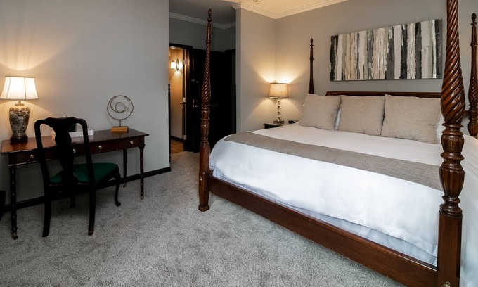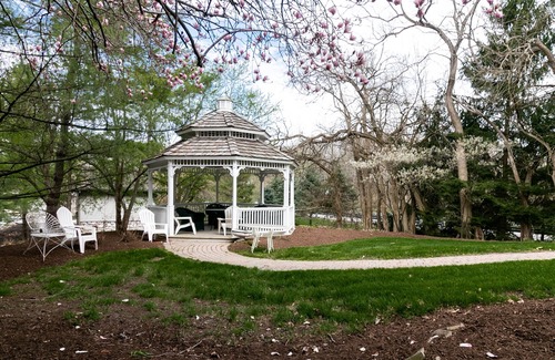 {caw – door} King bed, full bath with Garden Bath for two, fireplace, lazy ceiling fan and walkout patio to the Dunrobin Gardens and Gazebo on the lower floor. Two comfortable sitting chairs, desk and chair, WiFi (wireless high speed internet), Comcast Xfinity TV and closet. Light Continental breakfast are included.