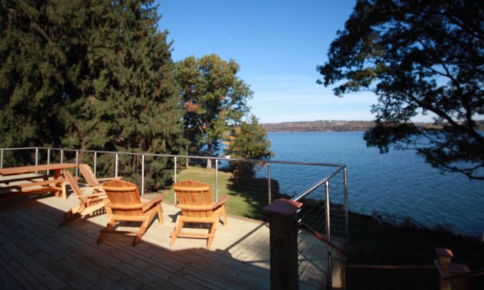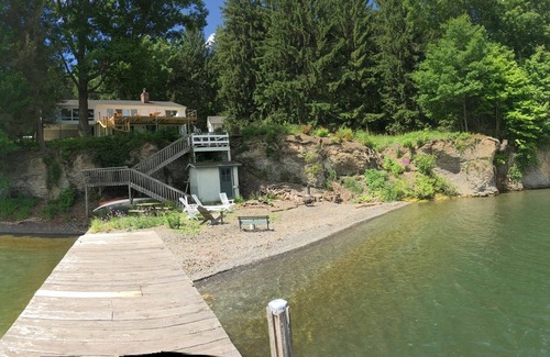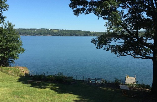 Stunning views of Cayuga Lake from the 42' x 15' deck, living room, dining room, office, and 4+ bedrooms. Picnic table on deck seats 10-12 people. Lots of privacy on 5.5 acres with 275' of beachfront with dock and changing shed. Two miles south of Taughannock Falls State Park and located on the Cayuga Wine Trail but only 10 minutes from Ithaca, NY, 20 minutes to Cornell University and Ithaca College. One king bed master bedroom, 3 queen bed bedrooms, 2 sofa beds and one double futon in the queen bedrooms on lower level. A 65" UltraHD TV is in the living room and 50" HDTVs is in each of two bedrooms. A den with a queen sofa bed can serve as a 5th bedroom. Paved driveway to the door. Very private at the house and on the beach.