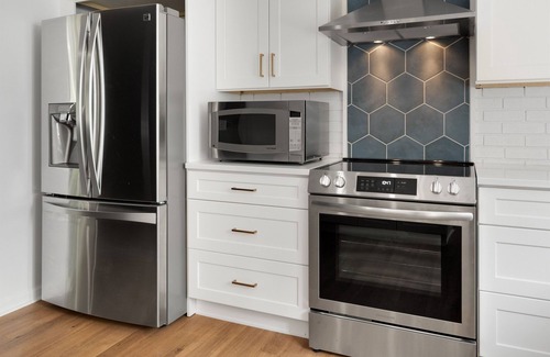 Two full contemporary bathrooms on the second floor and one half-bath on the first floor allow guests to spread out and enjoy their own space. The master bathroom offers a tub and shower combo, and the second full bathroom features a tiled walk-in shower. Each bathroom is appointed with a hair dryer, paper products, and hand soap, but be sure to bring your own toiletries, including shampoo, conditioner, and body wash. 🚿🛁🧴