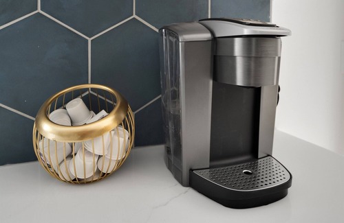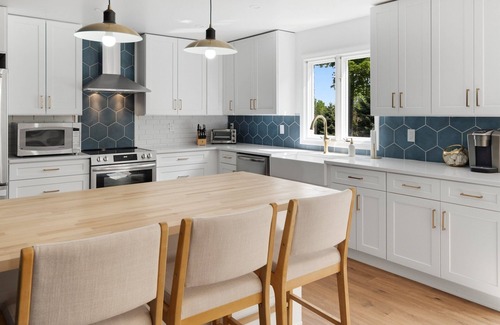 The main floor’s open floor plan, 8-person dining table, large island with extra seating, and inviting family room create the ultimate gathering space for your group to relax and enjoy time together. If the conversation wanes, the living room’s large flat-screen TV and family games provide great entertainment! On rainy days, sign into any app on the Smart TVs to catch up on your favorite shows. Attention to detail was paramount in the design of this well-appointed kitchen. You’ll find everything you need to create a memorable meal, including a stainless steel stove, oven, dishwasher, and full-size refrigerator and freezer. The kitchen is stocked with olive oil, salt and pepper, and most cookware items needed to prepare a great meal—just be sure to bring your own seasonings and food. In the morning, enjoy complimentary K-cups, non-dairy creamer, and sugar to start your day. 🍽️📺☕