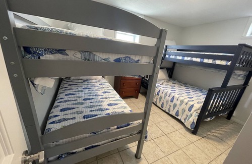 This is a renovated lakefront home in Union Springs, NY with private upper and lower separate 3-bedroom units rented together. This unique setup is wonderful for multiple families traveling together. The large lake-front yard is wonderful for games, picnicking, sunset watching, and evening fires on the stone fire-pit patio. The docks provide for a defined swimming area for little ones, easy fishing for several at a time without worry of tangled lines, and buoy lined docks for tying up a boat. After a long day together of lake fun, retreat to your own private spaces for TV watching, reading, and relaxing. Each 3-bedroom unit has an open concept full kitchen with eating area, bathrooms, and living room with separate access and privacy between the upper and lower units. Lower unit is a no step walk-in. Upper unit has a 4-step entrance. 2600 square ft. 6 bedrooms, 2.5 baths, 2 washers/dryers, newly remodeled. Upper Unit: B1 -1 king bed, B2 - 1 queen, B3 - 1 bunk w/ double bottom & twin top, sectional sofa in living room, kitchen fully stocked, 1 bathroom w/ full walk-in shower, stackable washer/dryer. Lower Unit: B1 - 1 queen with walk-out to lake & desk for working at home, B2 - 1 queen & 1 twin, B3 - 2 bunks (twin over twin, double bottom & twin top), sectional sofa in living room, kitchen fully stocked, 1 bathroom w/ full walk-in shower & 1 half bath, side by side washer/dryer