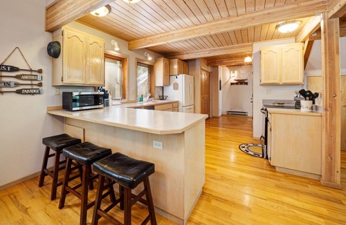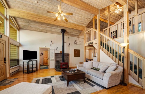The home features three bedrooms and a large living room with wood burning stove. The loft has three small arcade machines and a table with seating for games and puzzles - old school fun while you are in the mountains. The deck features a gas fire pit for roasting marsh mallows.