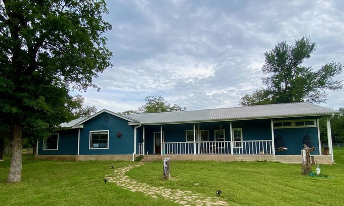 "Cedar Creek Chateau" on the outside is a nod to Texas bluebonnets in this beautiful 3 bed, 2 bath blue home with a large gate entrance for total privacy and security.