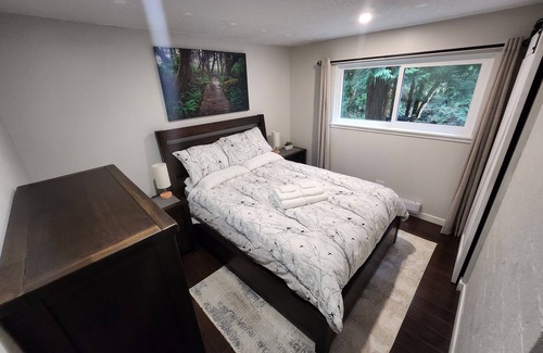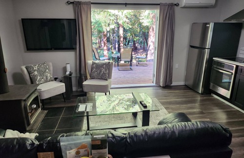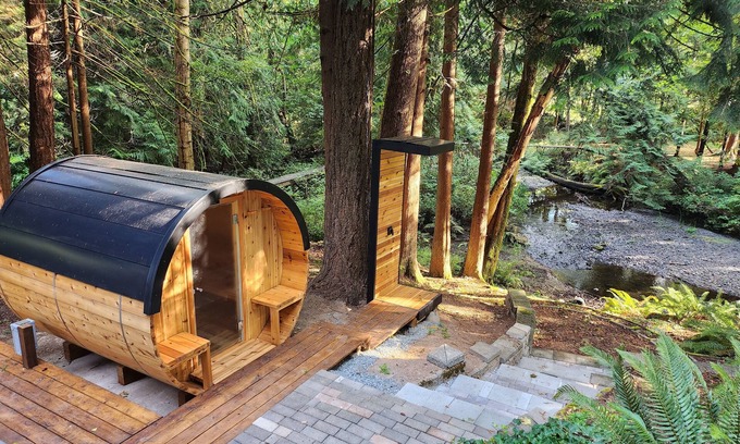 Read, relax, re-energize in a newly renovated 800 sq ft, 2-bedroom lower-level upscale suite. The living area has a brand-new fully equipped quartz countertop kitchen, with a private french door entrance and smart lock, that opens onto 240 sq ft of private deck space and fire table overlooking a tranquil stream and forest on a shared acreage with a cedar barrel sauna and outdoor shower, in an owner-occupied home.